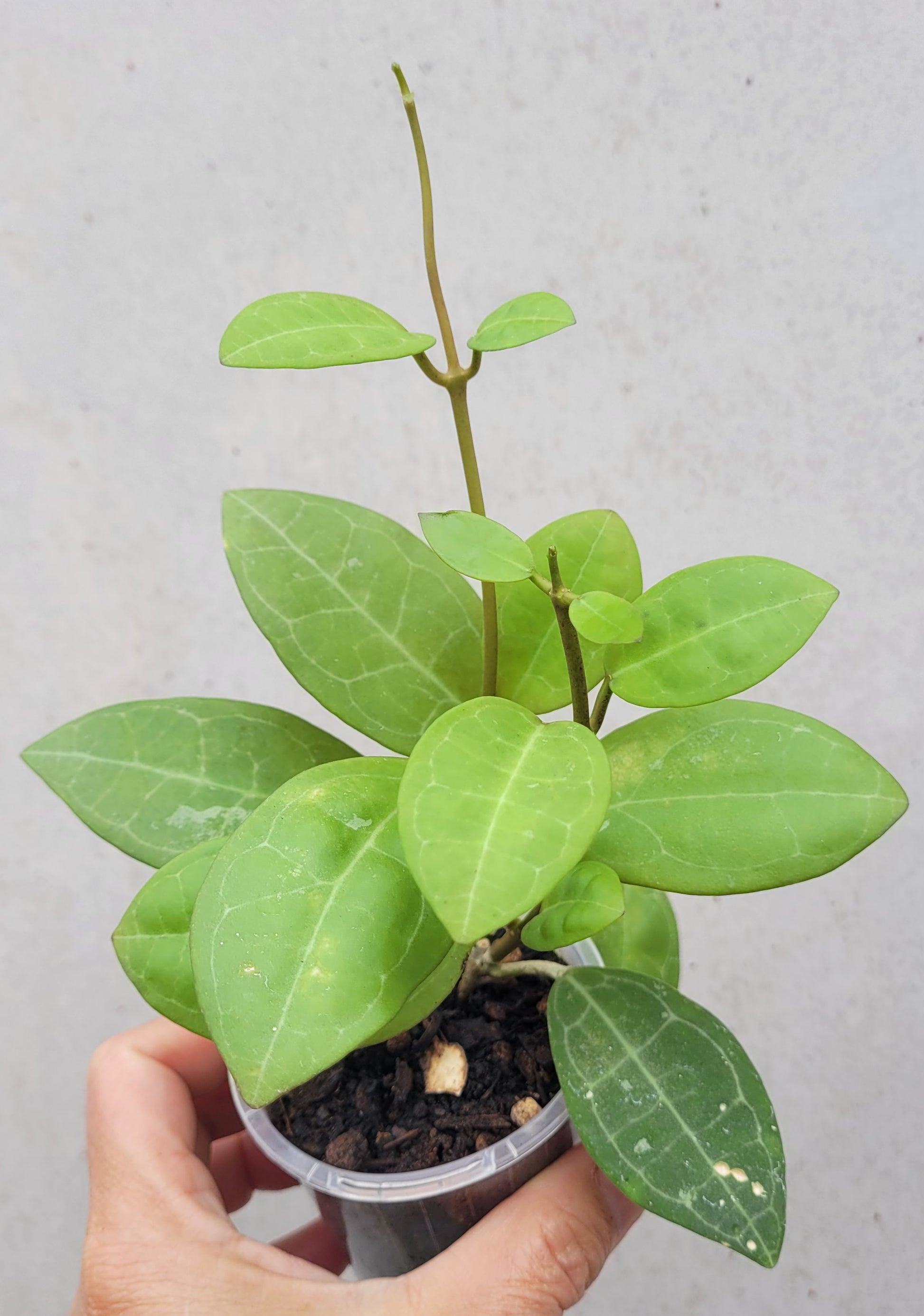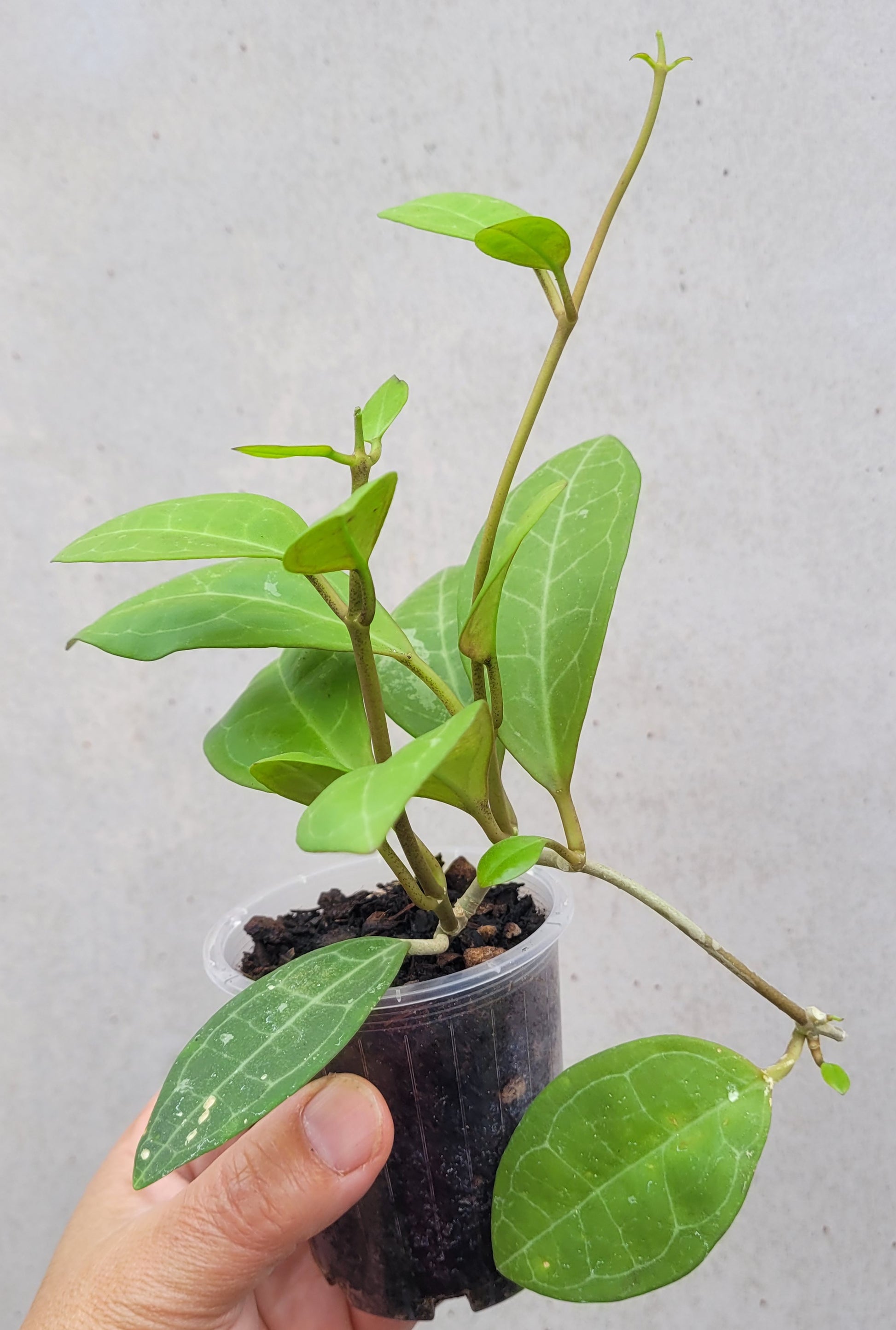 Hoya elliptica is a unique species with elliptical turtle shell like veination. Flowers have a fruity tropical scent. This plant has multiple growth points coming through as shown in photos.