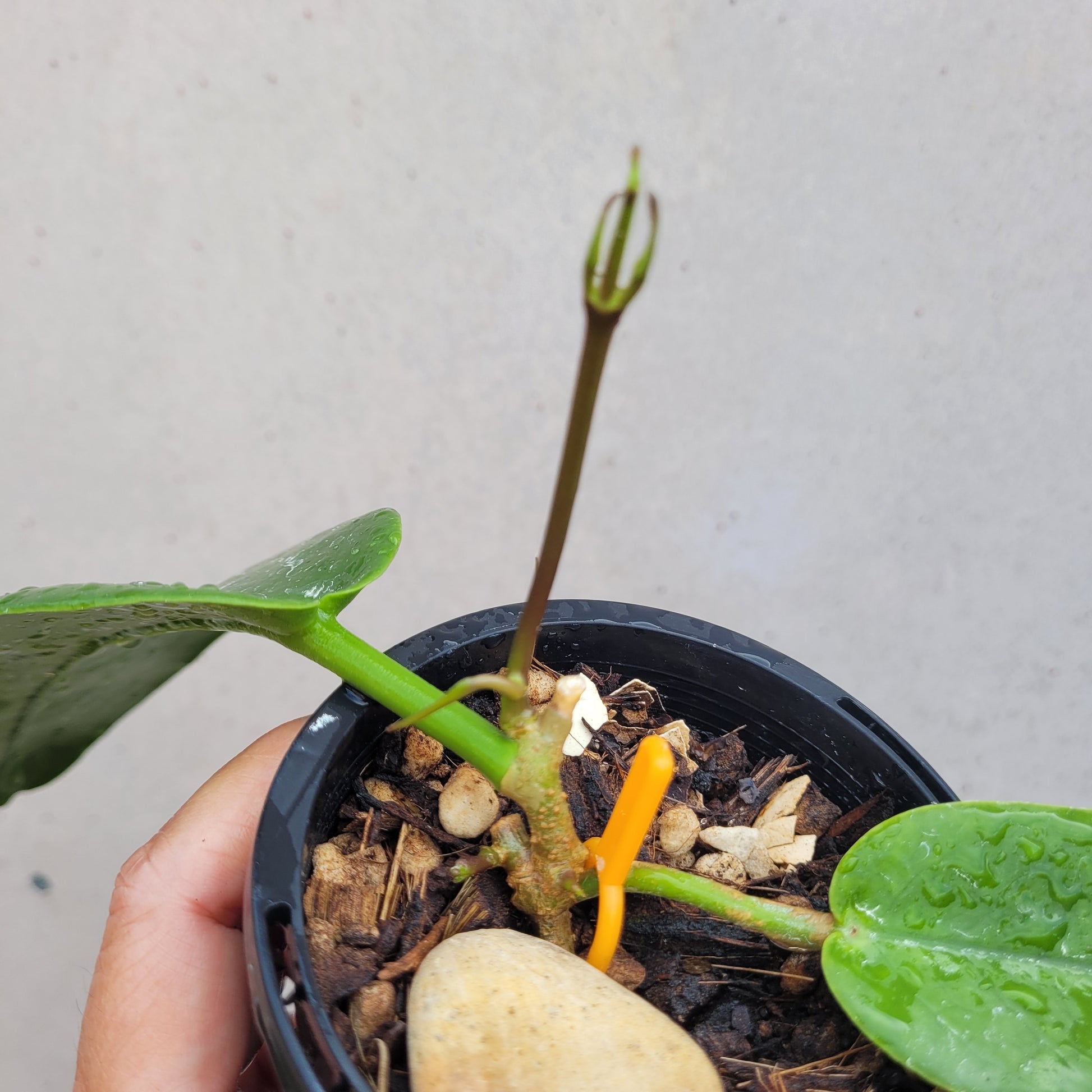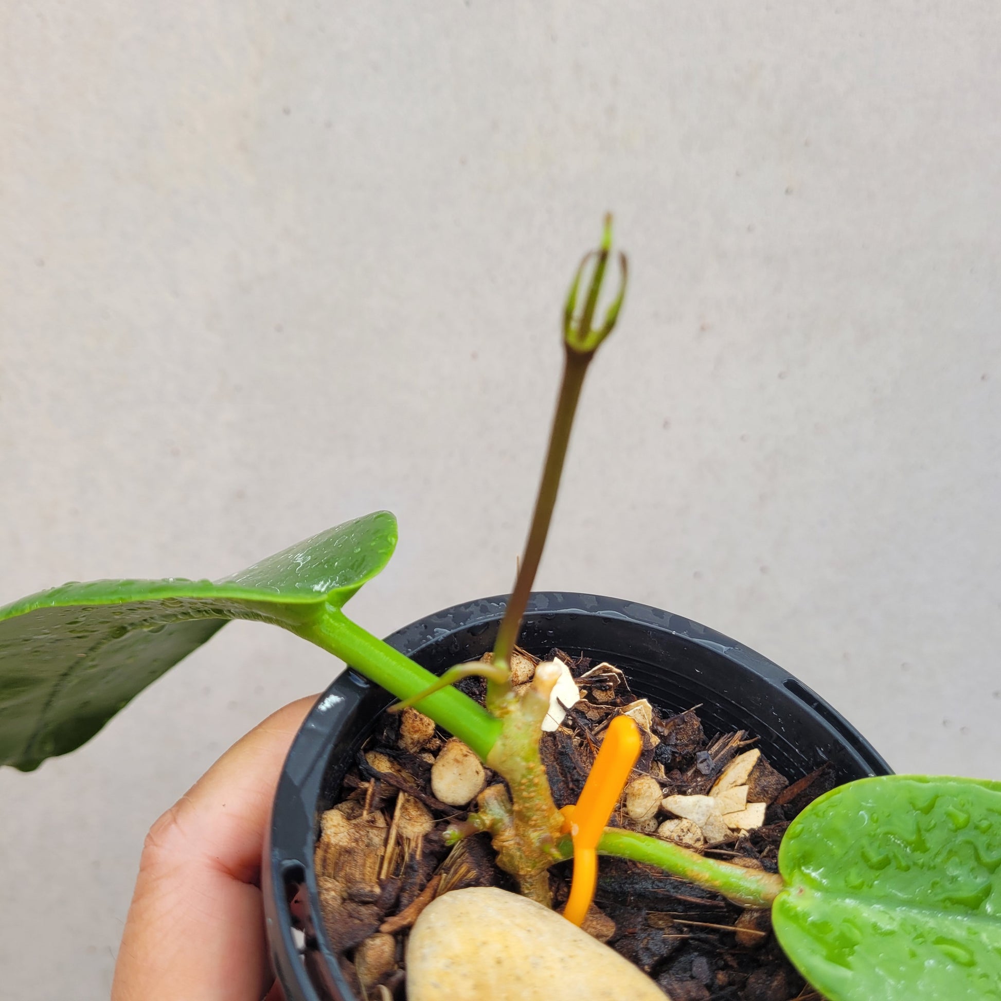 - 🍃 robust, climbing stems and large, thick, dark green leaves that can grow up to 20 cm long. New growth often starts with a burgundy tint before turning green.
