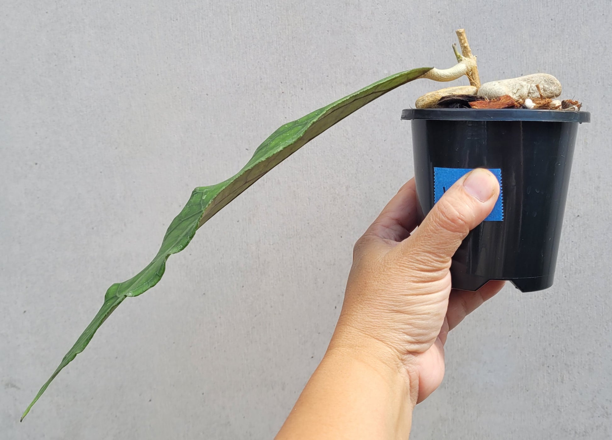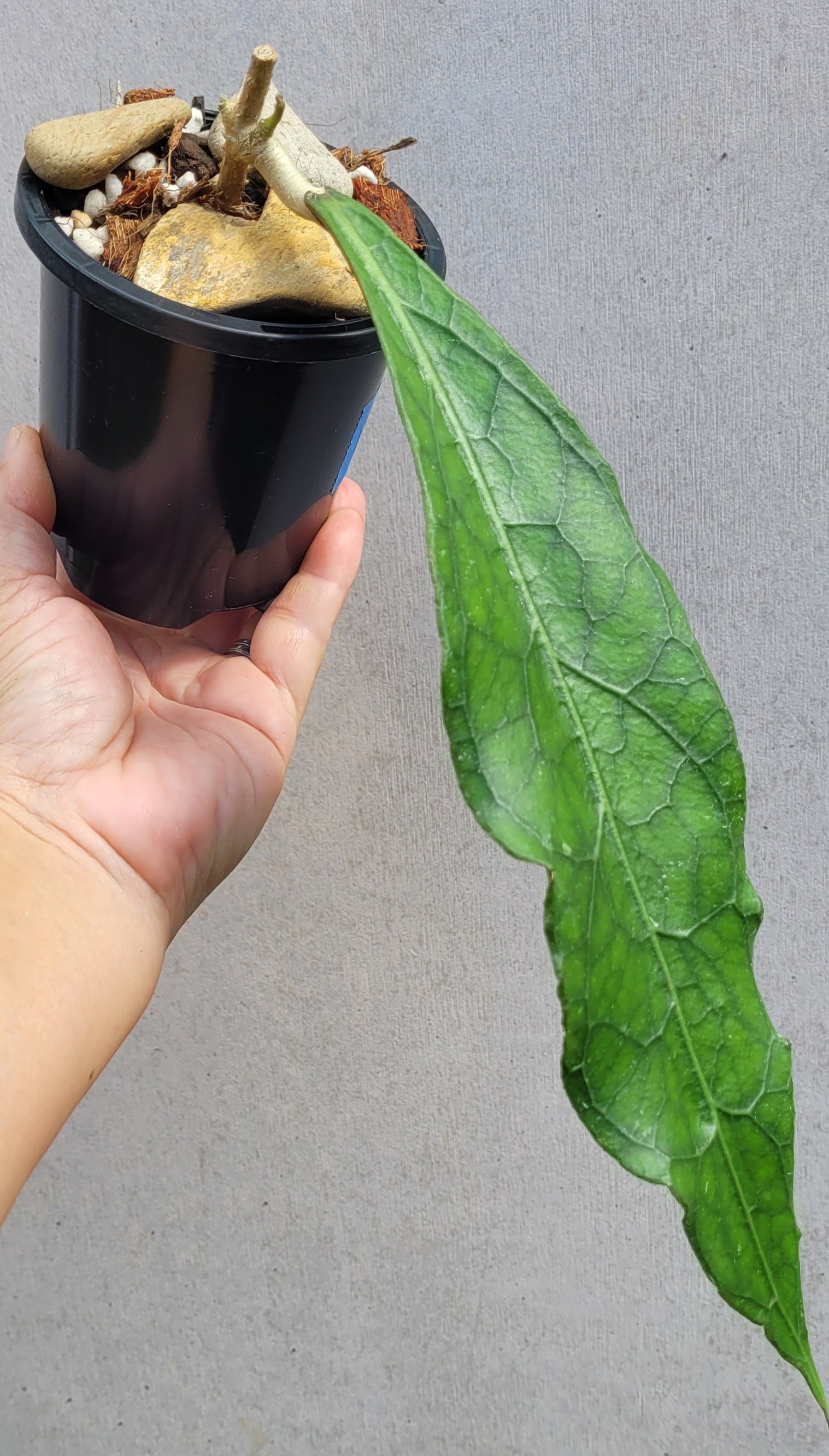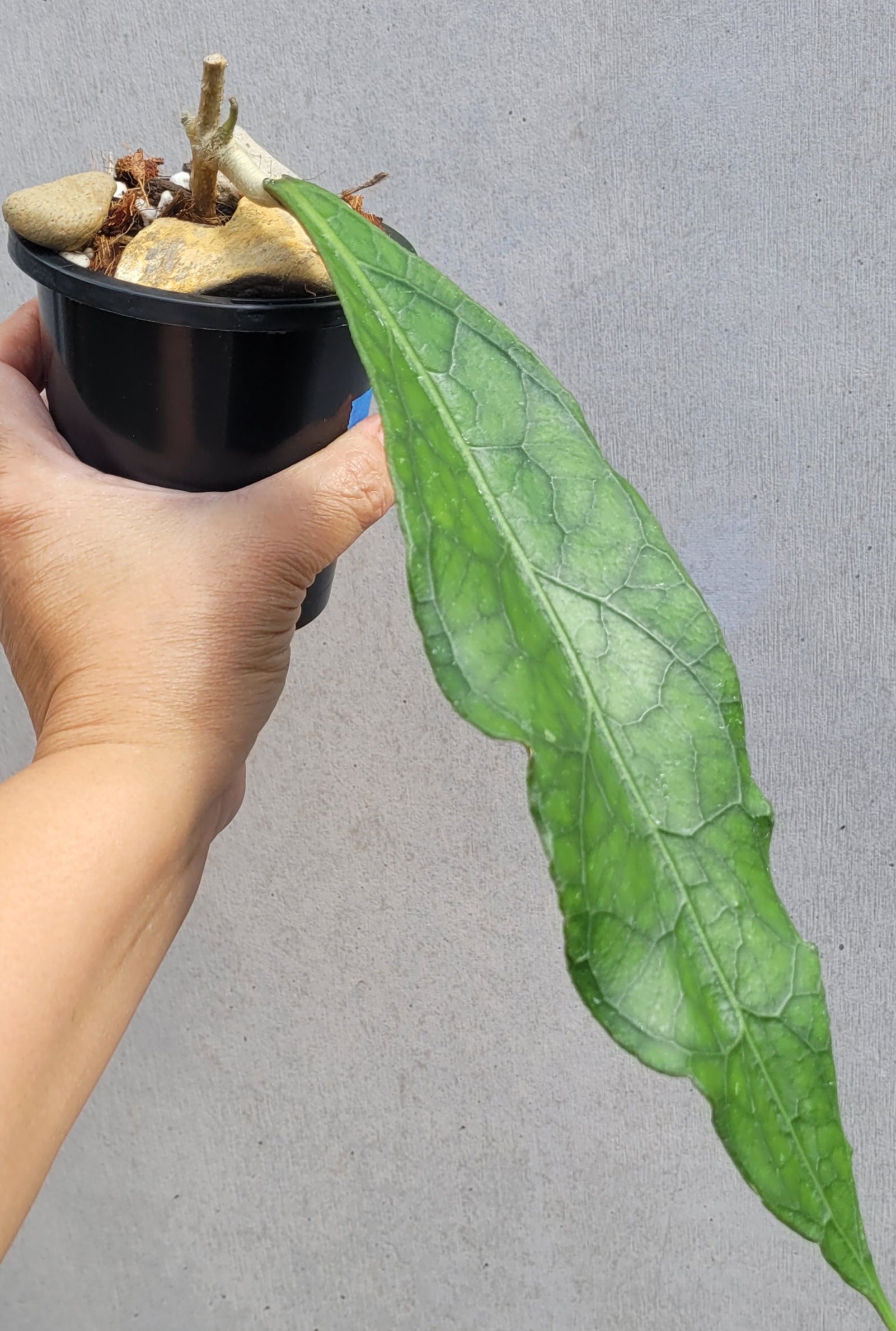Dagger shaped leaf with prominent dark green veining and a pointy tip. A beautiful hoya to add to your collection. Leaves can get very large as plant matures. This leaf is approximately 26cm long, plant currently growing 9cm pot.