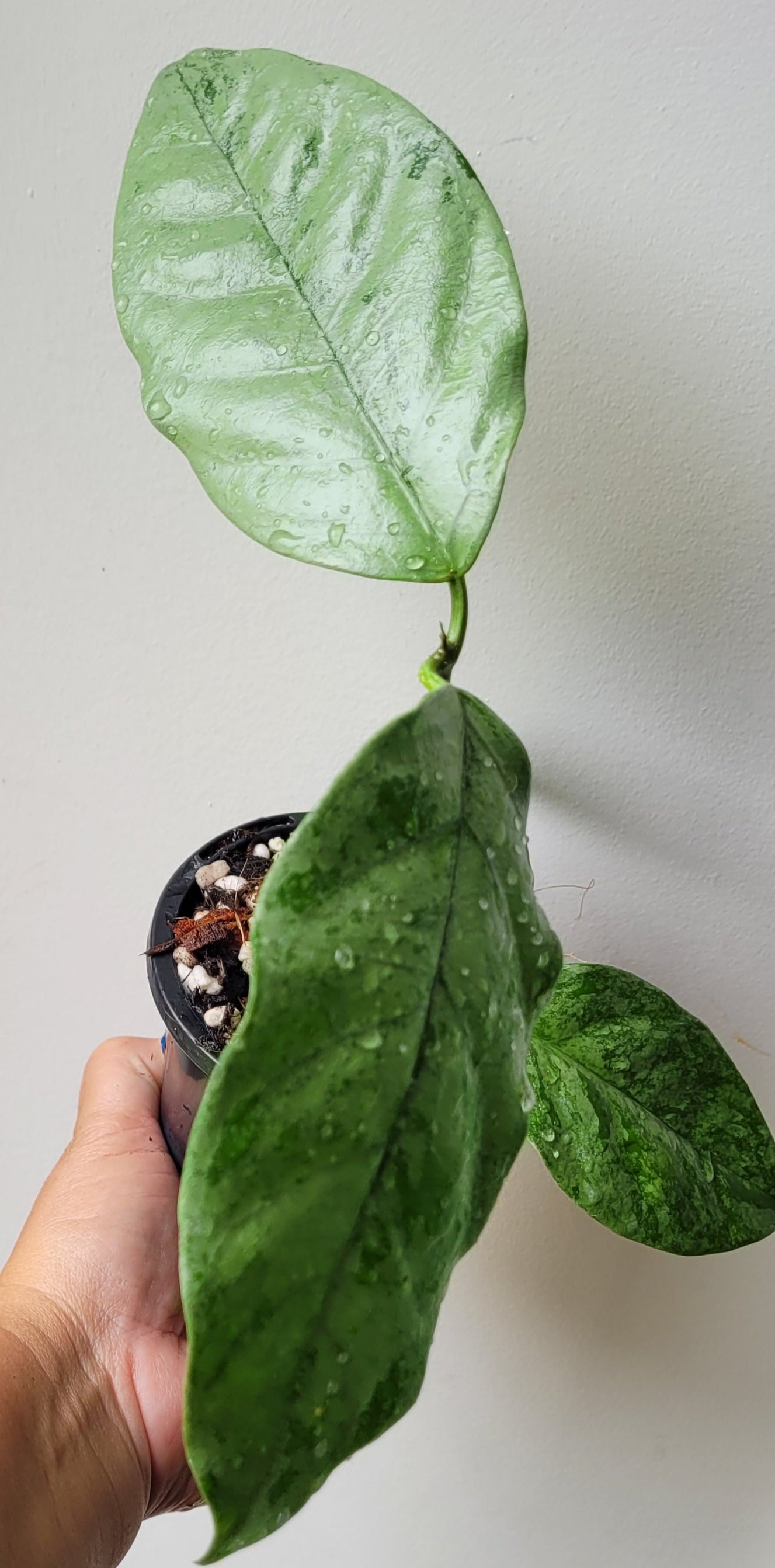 Hoya coriacea Silver is a vigorous climber from Southeast Asia. It has broad, glossy leaves with extensive silver mottling, sometimes referred to as a "silver splash." A must to collect for any hoya collector.