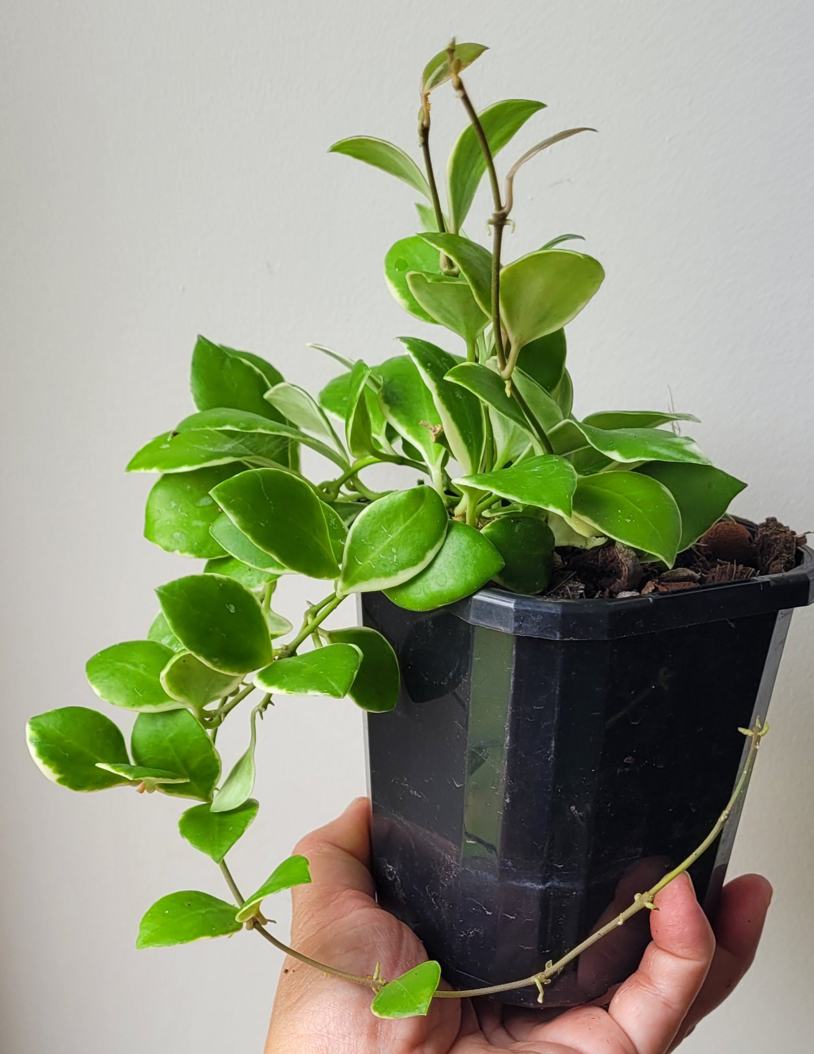 Hoya heuschkeliana albomarginata is a variegated form of heuschkeliana. It has small, narrow green leaves with creamy outer variegation. In high light, new leaves may exhibit pinkish-red hues. A hoya best suited in a hanging basket, known for its soft pink, bell-shaped flowers with a sweet fragrance.