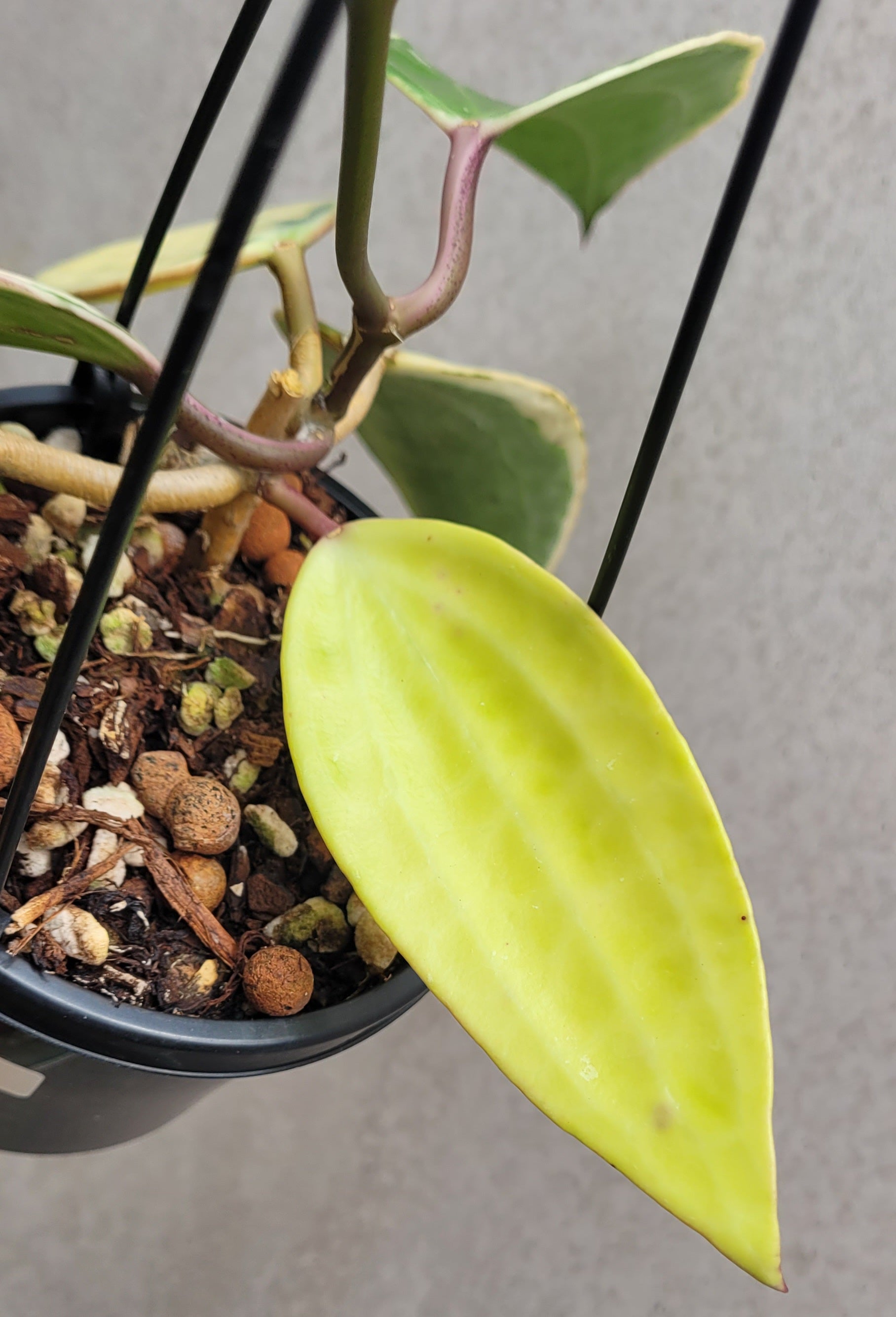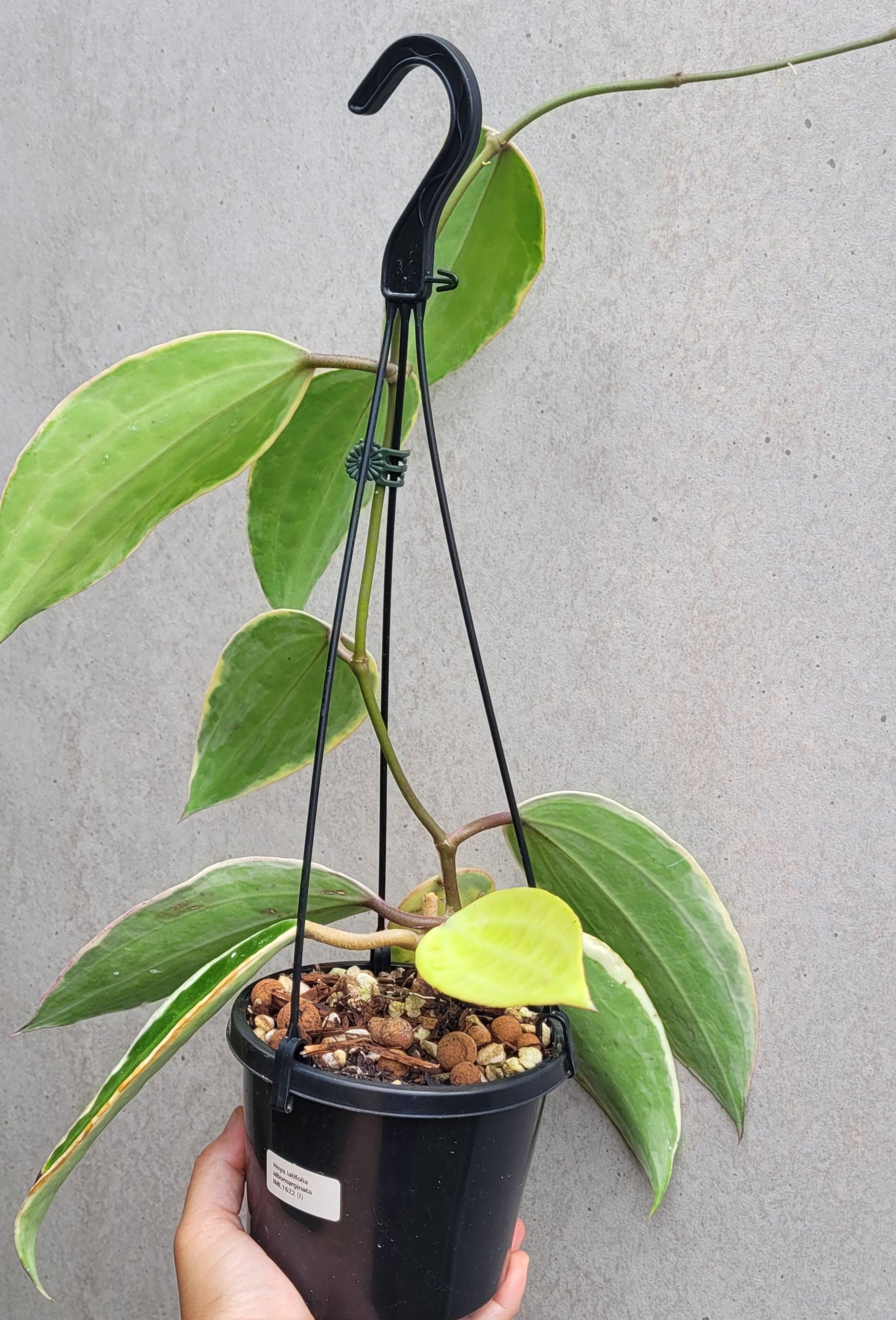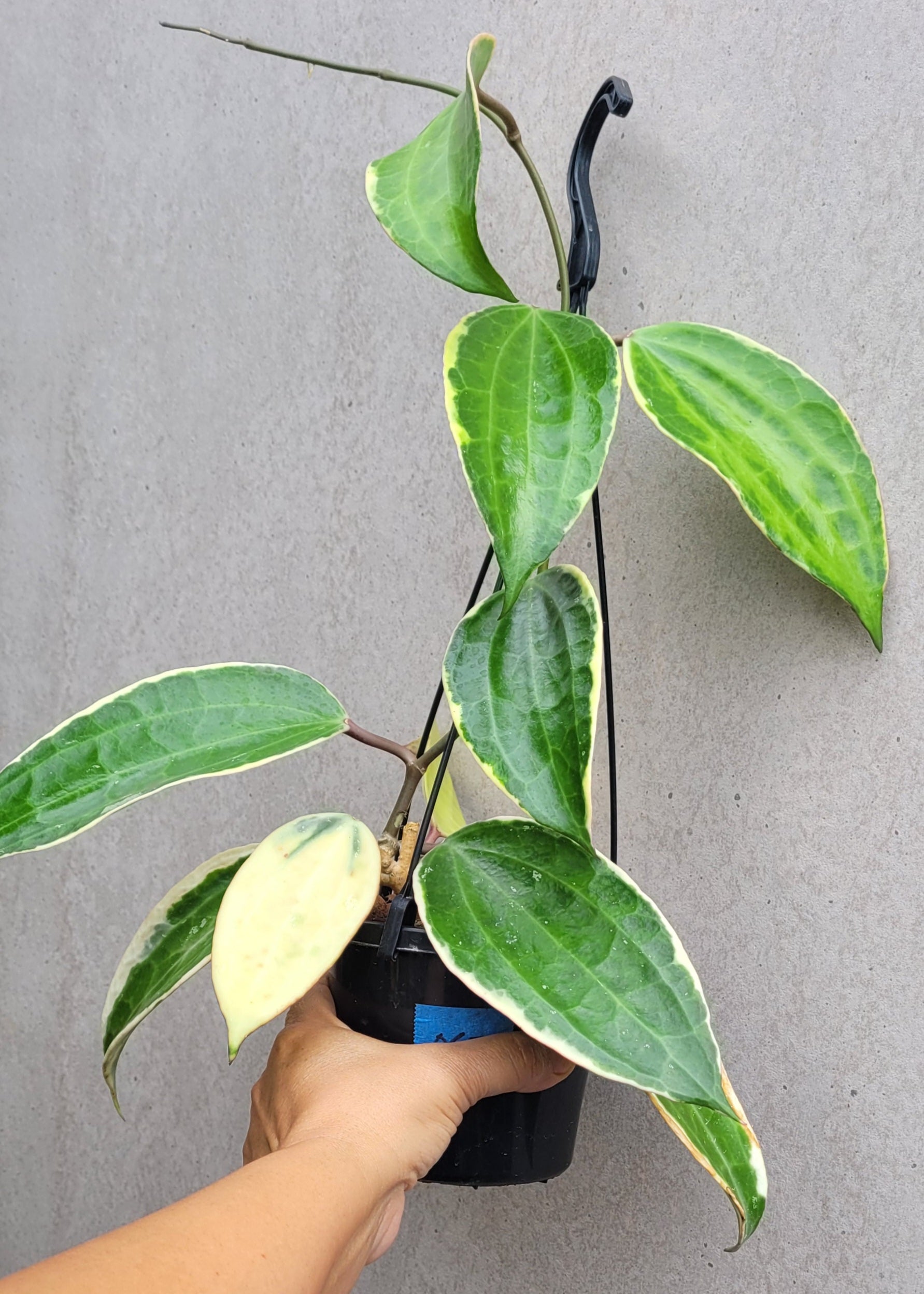 Hoya latifolia albomarginata IML1622 (formerly H. macrophylla var. variegata) features distinct glossy green leaves with cream-white margins and prominent raised veins. Unlike most Hoyas, which have a vining habit, this variety is an upright, climbing plant. To continue the variegation, continue to grow under bright filtered light conditions. Can develop a pink/red blush on the margins in bright light (sun).