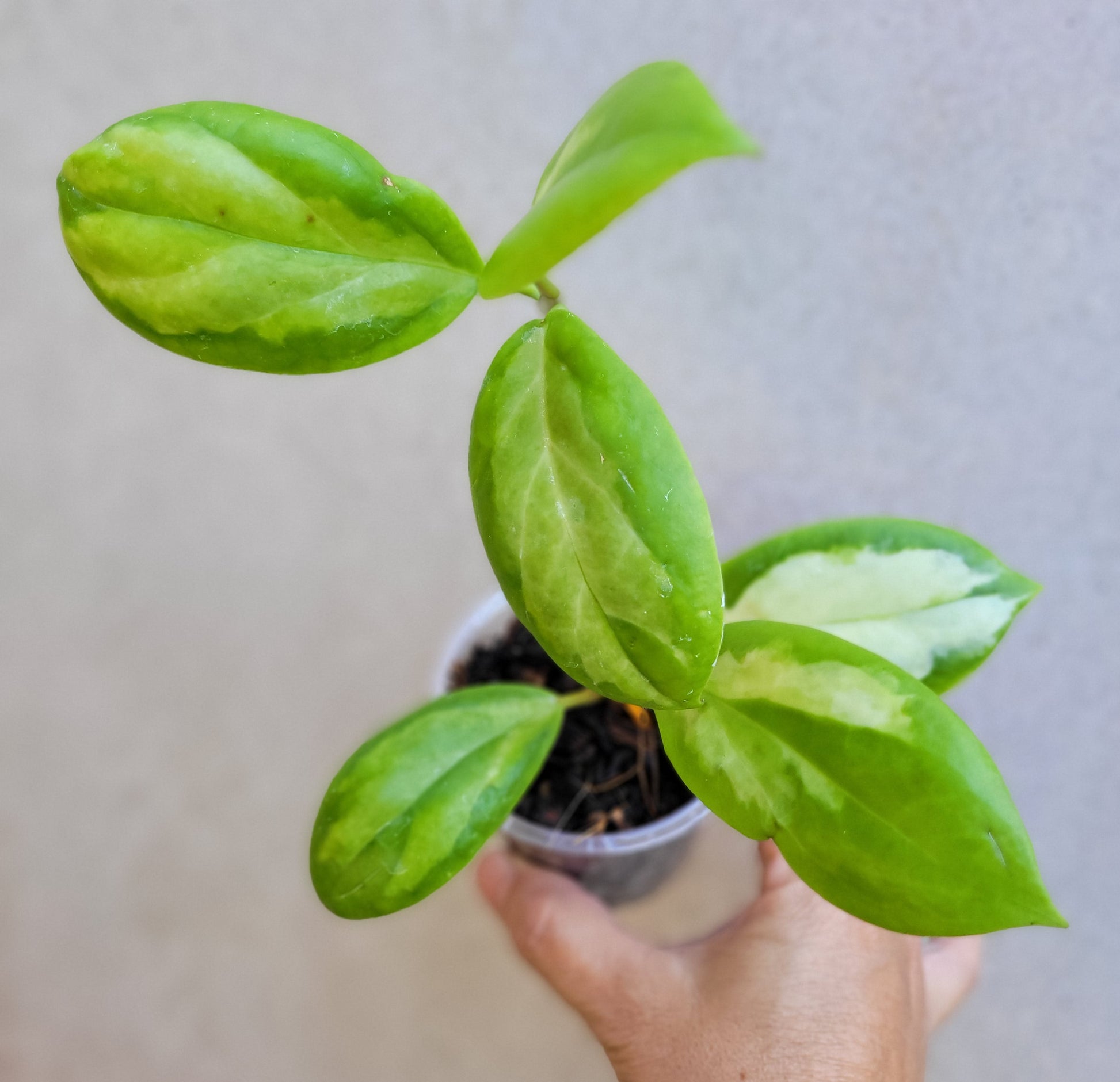 This hoya species produces gorgeous inner variegated leaves and pale cream yellow flowers. The inner variegation on the leaves vary from greenish cream to creamy white colour tones depending on growing conditions.